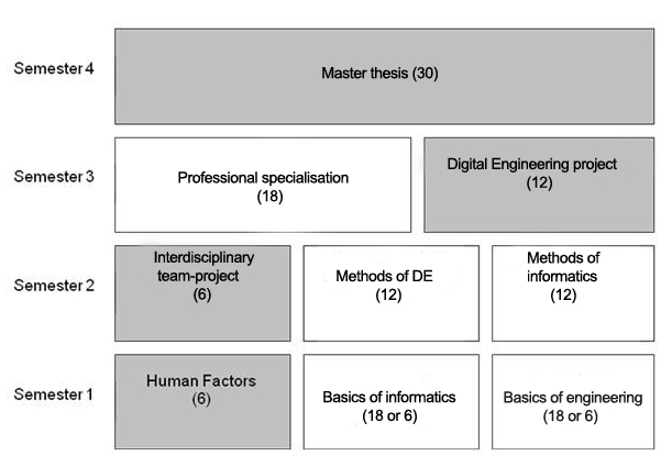 One the one hand there is a professional specializing of lectures in certain using domains (e.g. process engineering, logistics, mechatronics, power engineering, medical engineering etc.) and on the other hand there is a specializing in a technological domain (e.g. visualization technology, interaction, interoperability, security, reliability etc.). Parallel the students will be integrated in a digital engineering project. Thereby they will be integrated in current research projects, offered by cooperating chairs and together with resources using of partners of industry-related research like the Virtual Development and Training Center (VDTC). Besides the professional consolidating you will find here an introduction in academic work, e.g. with collaboration on scientific publications or rather participation at scientific events.